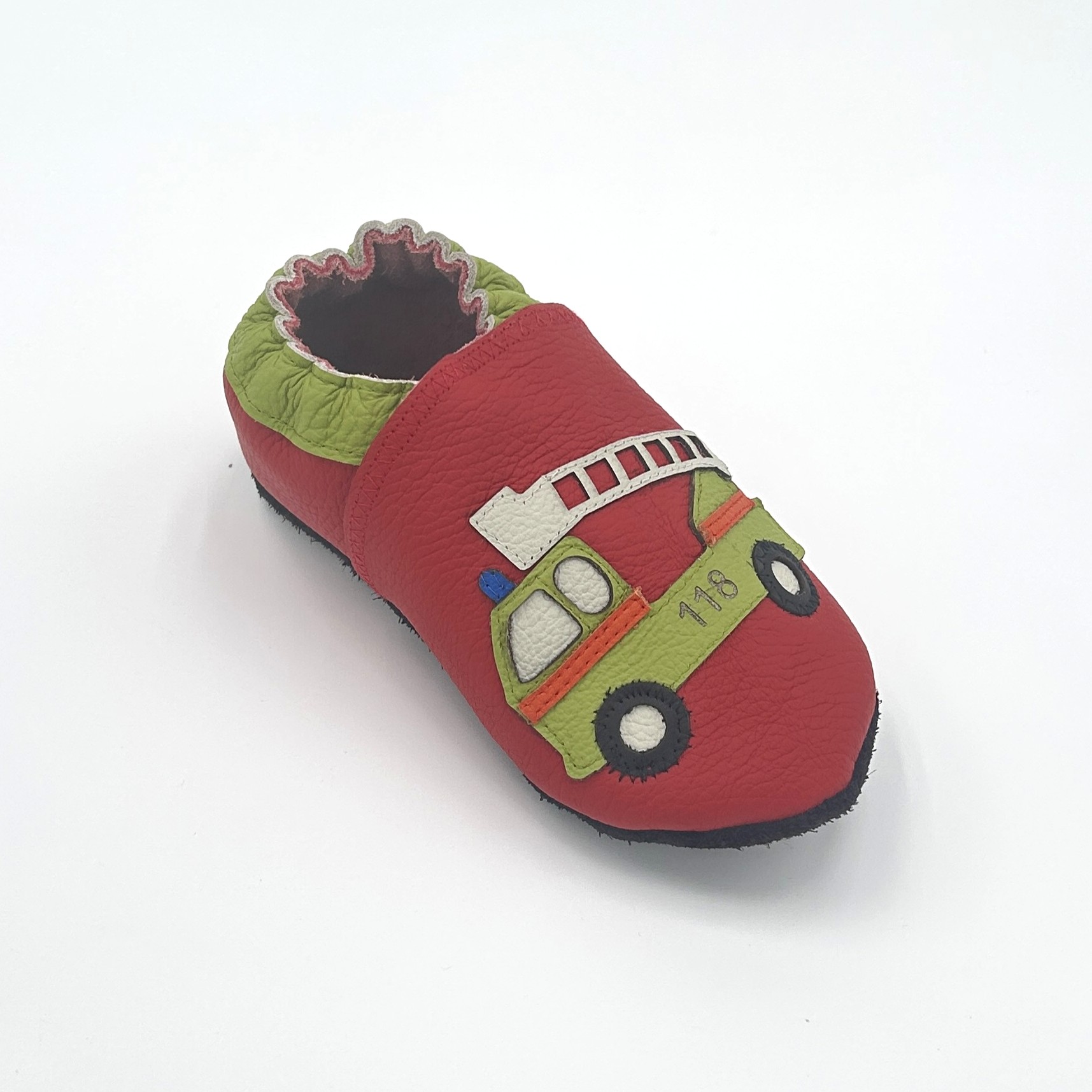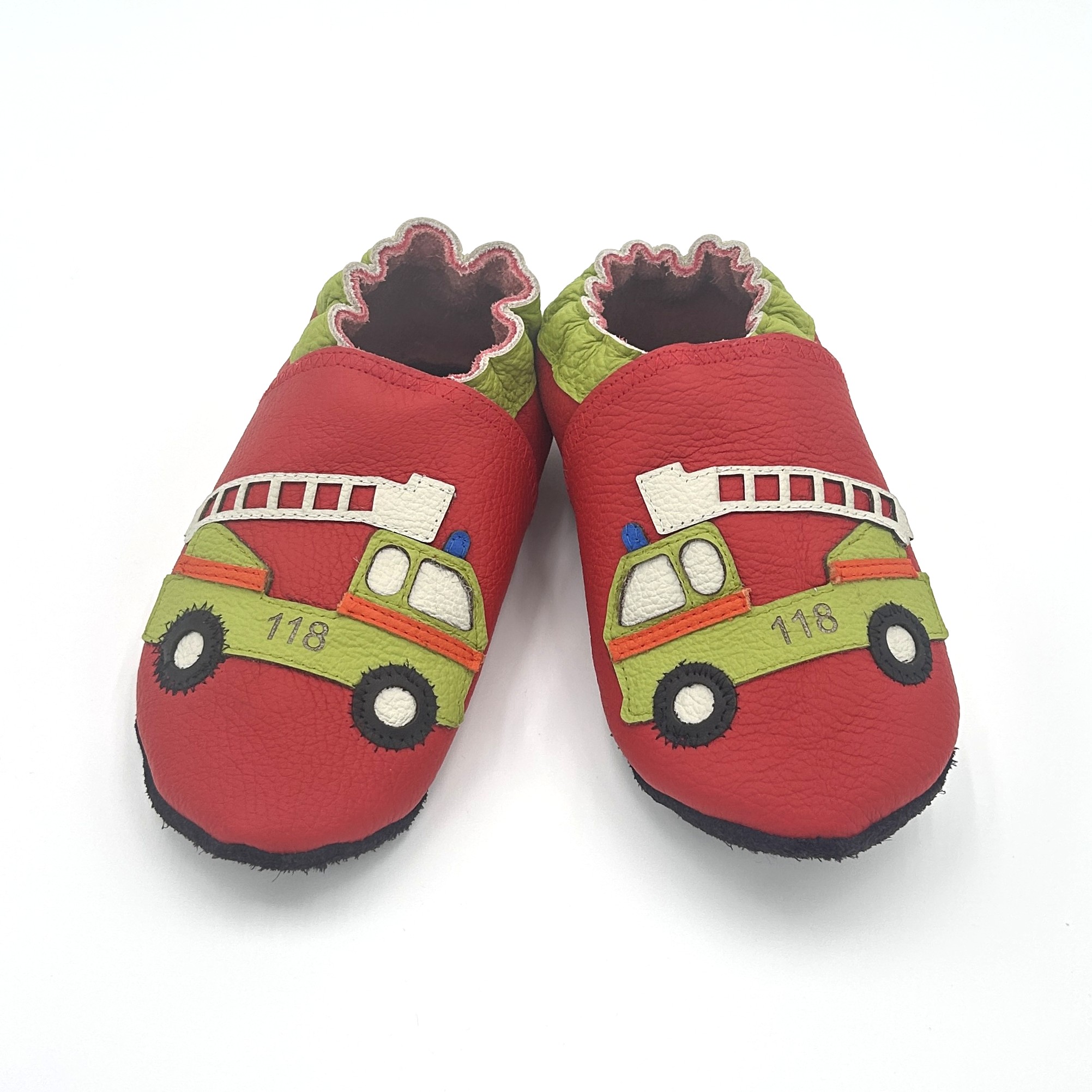 Start / Leder-Finkli / Finkli ab Kindergarten / Lederfinkli „Feuerwehr“ auf rot