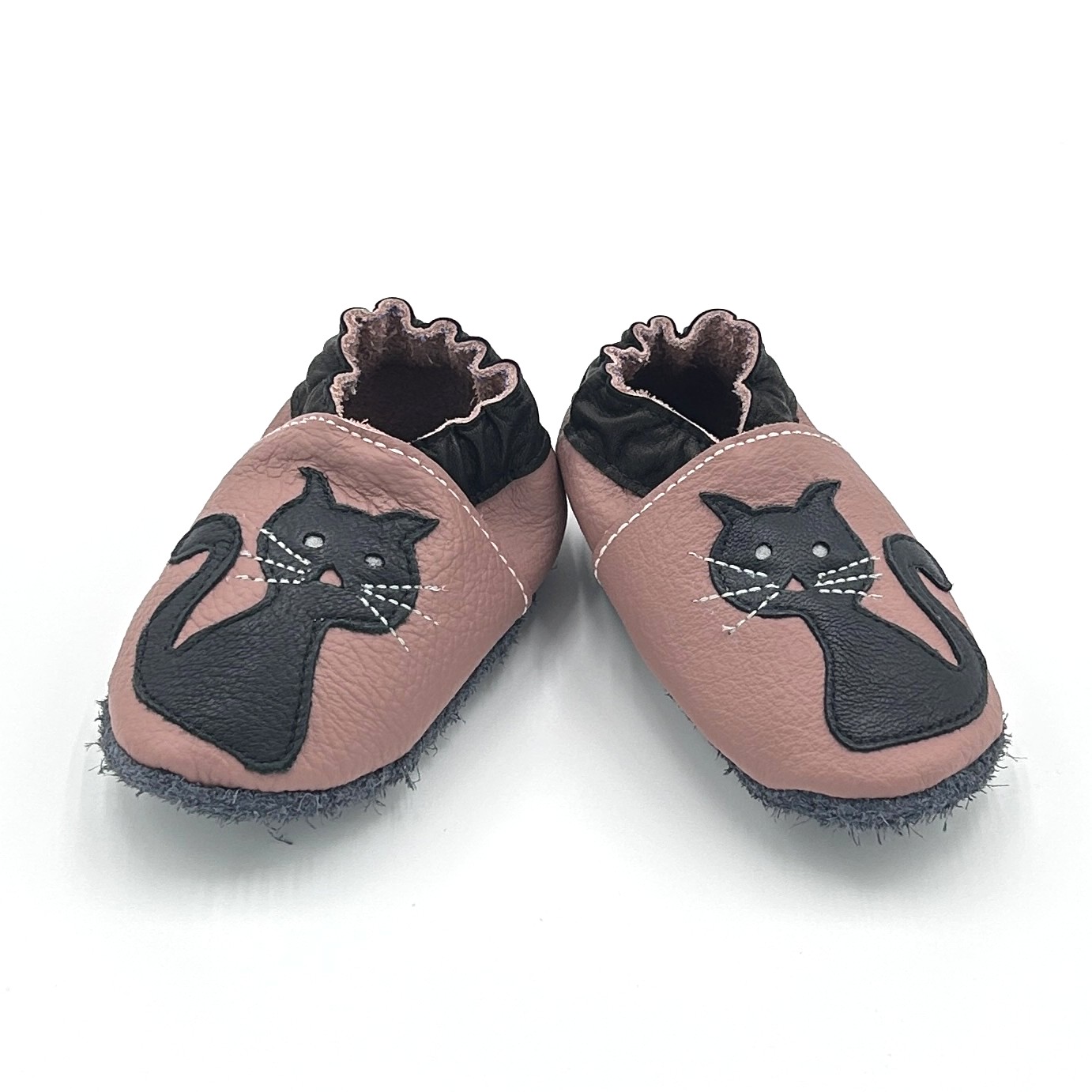 Start / Leder-Finkli / Finkli ab Krabbelalter / Lederfinkli „Schwarze Katze“ auf rosa