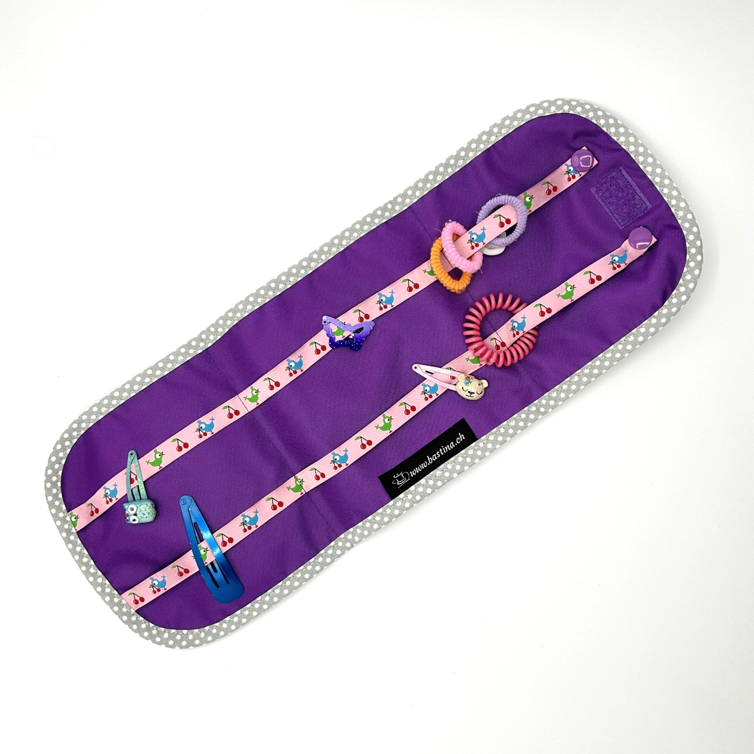 Zwei Drittel der Bänder im Innenbereich sind seitlich fixiert, dort können die Spängeli bequem eingeklickt werden. Das rechte Drittel ist mit einem Druckknopf versehen. Dort können Haargummis auf die Bänder aufgefädelt werden.